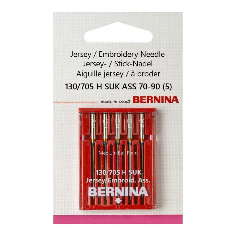 Высококачественные иглы 002 511 71 10 Bernina 130/705 H SUK ASS 70-90 с шариковым наконечником средней толщины. Шариковый наконечник скользит между нитями ткани, не повреждая их. Подходит для трикотажа и вышивки.