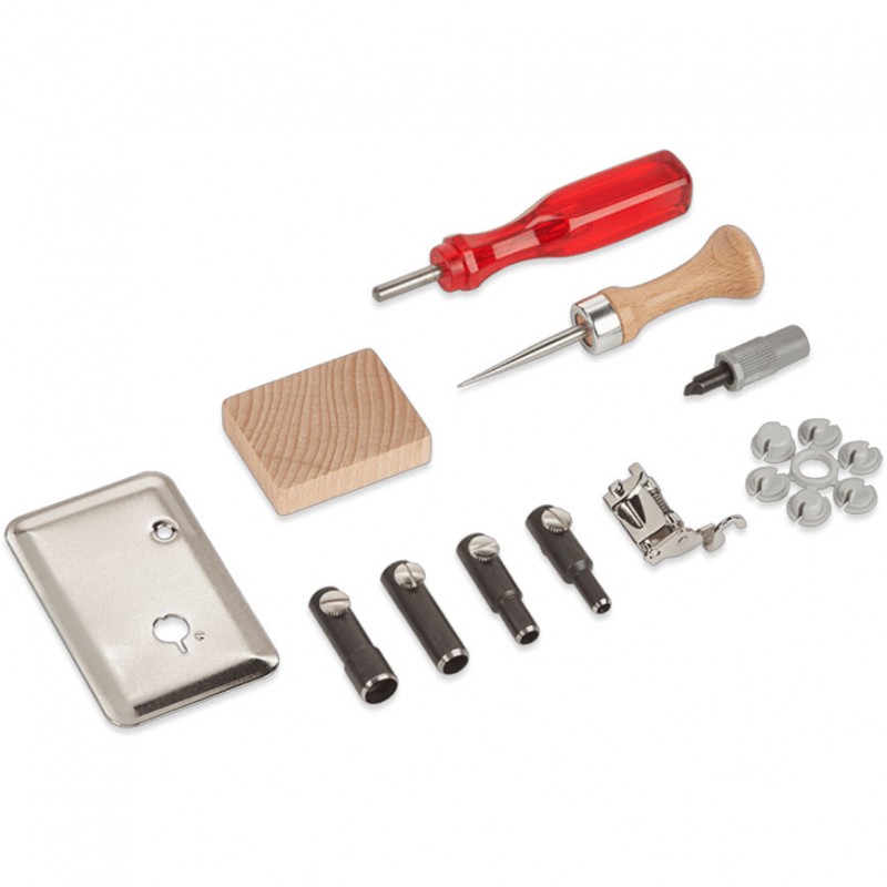 С шестью различными оправками для люверсов вы можете создавать люверсы шести размеров. В комплект также входит лапка для вышивания люверсов, лапка для свободной стежки, которая не прижимает ткань к зубчатой рейке - ткань удерживается на месте вертикальным пружинным механизмом, предотвращающим смещение иглы во время шитья. Набор чрезвычайно универсален, позволяя вышивать элегантные скатерти или чехлы для подушек с изящными украшениями, а также пришивать сплошные люверсы на куртках или рубашках.